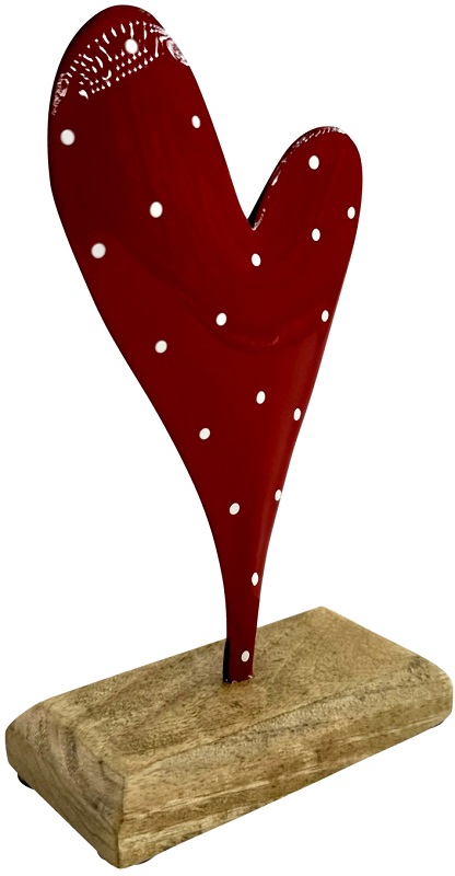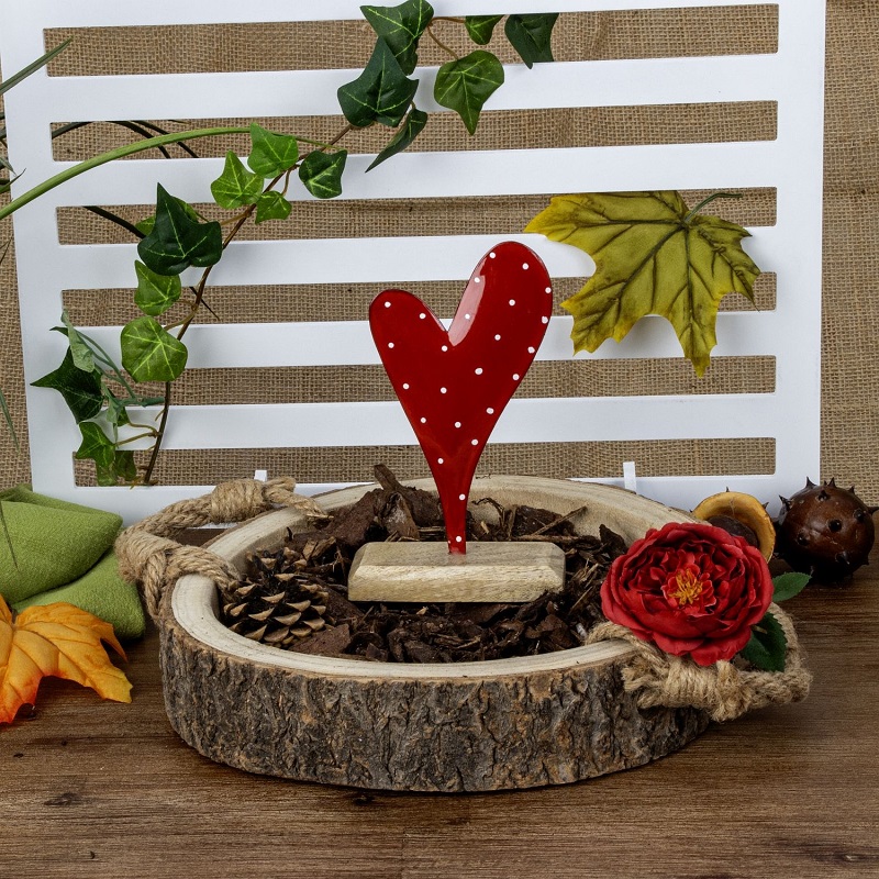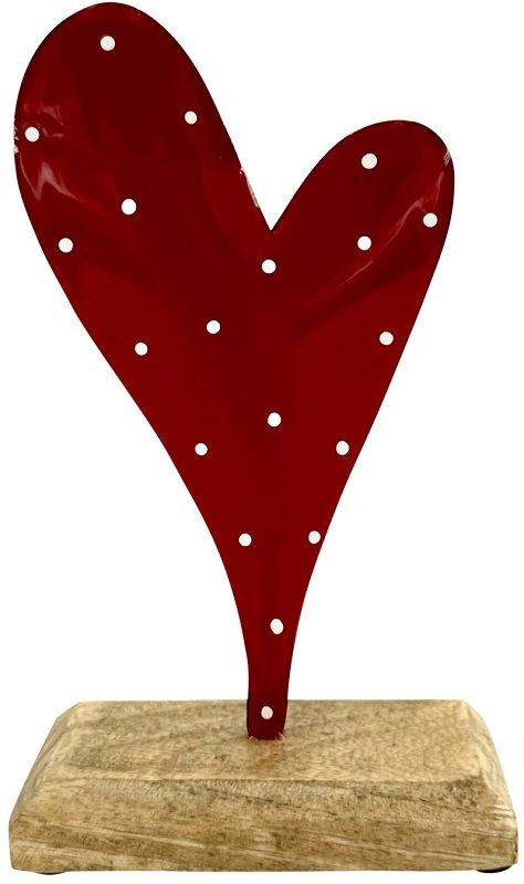 Deko Metall Herz Rot glänzend mit weißen Akzenten auf Holzsockel ca. 17 x 10cm