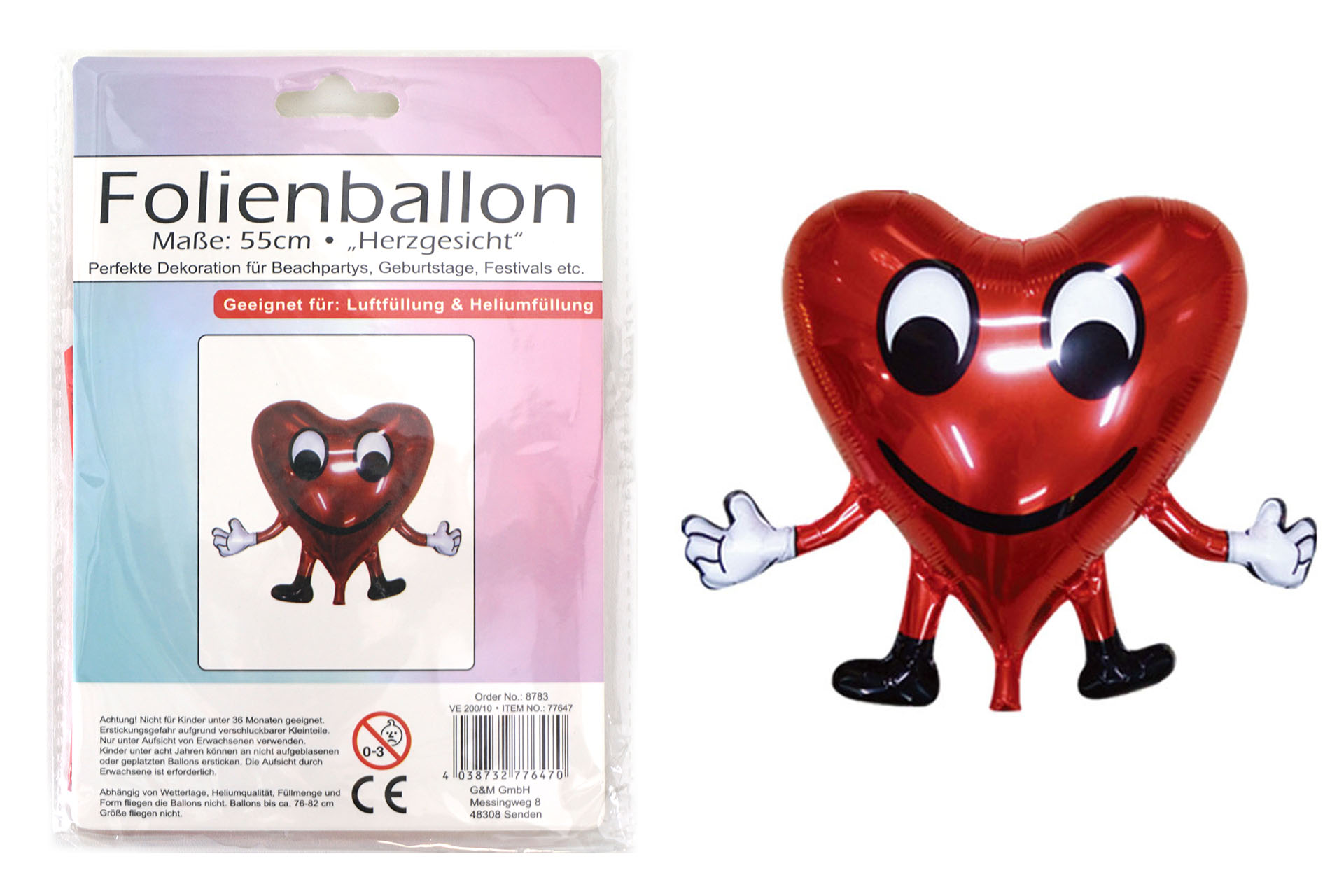 Folienballon "Herz mit Gesicht" ca. 55cm befüllbar mit Helium/Luft in Polybag mi