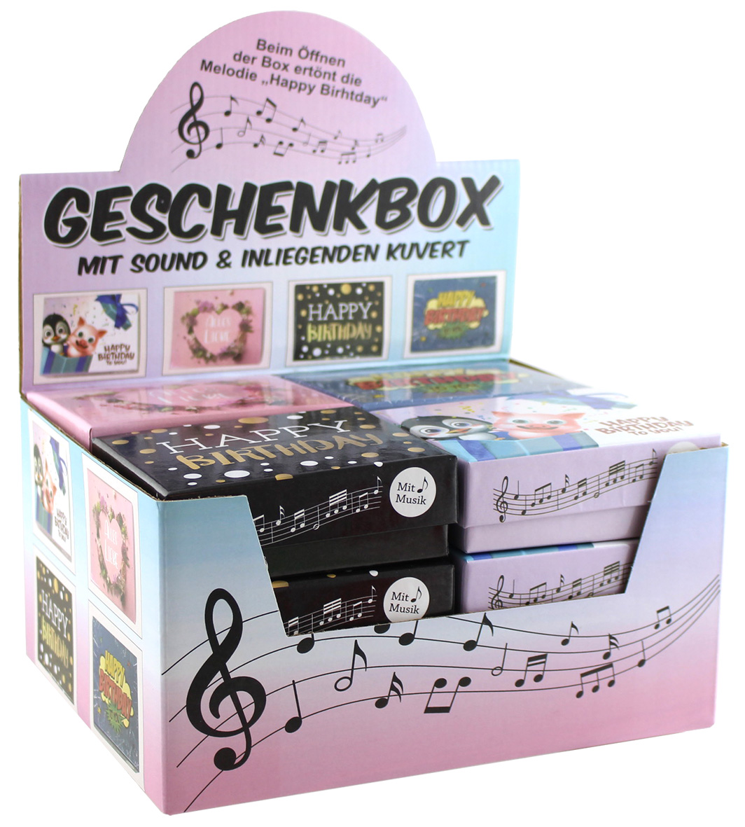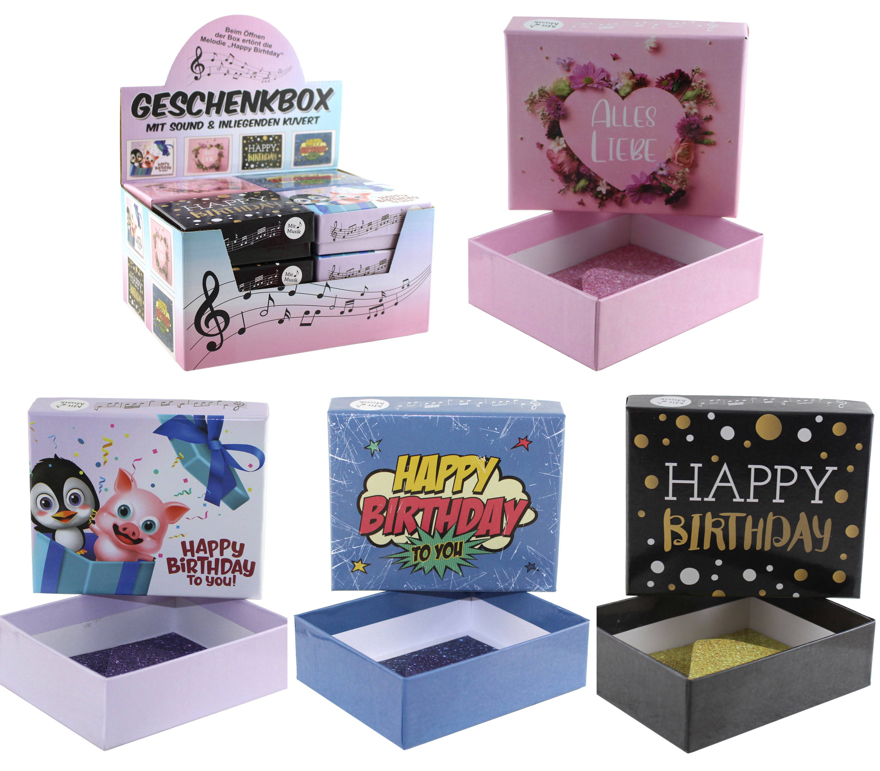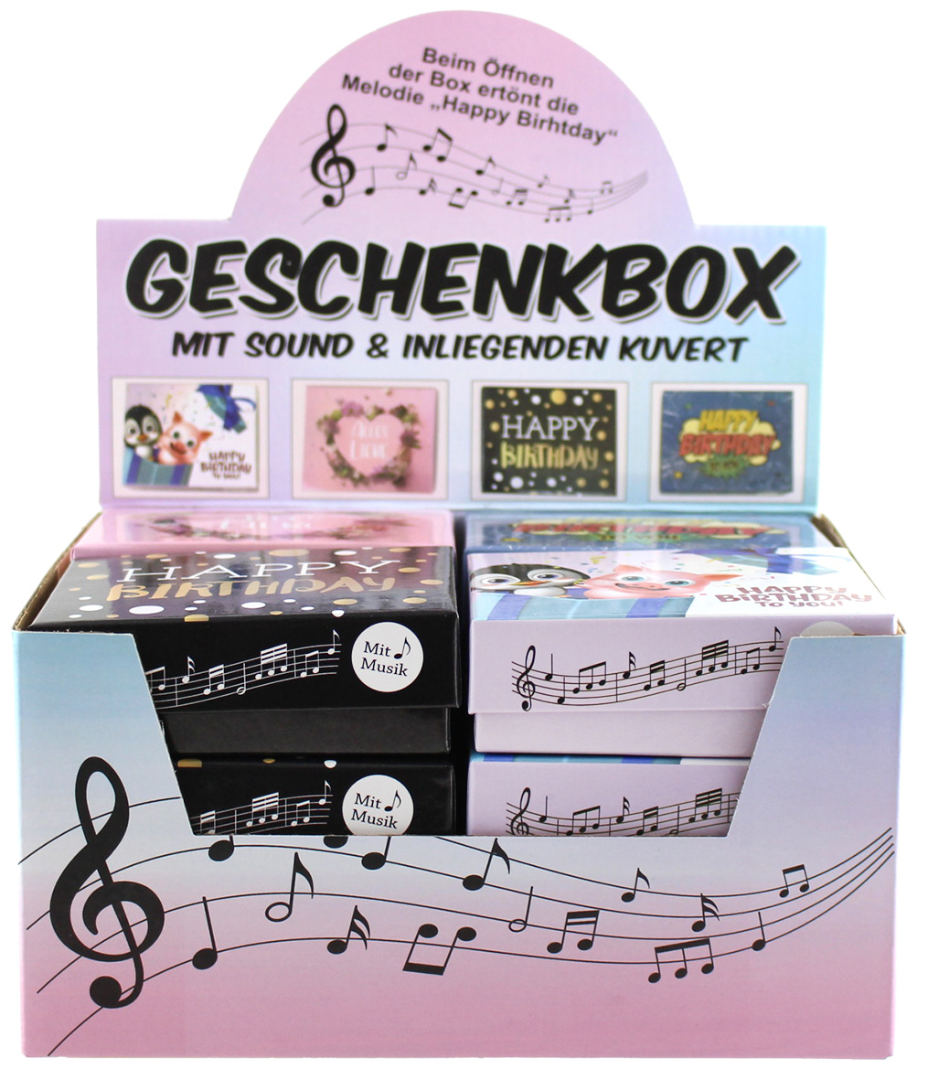 Geschenkbox mit Musik "Happy Birthday" 11x9cm, 4 Designs (Batt. 2xAG13) 12er D-Dsp.