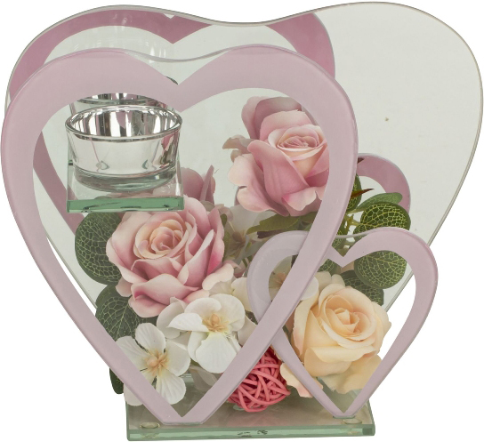Glasdeko in Herzform für ein teelicht geschmückt mit versch. farbigen Blumen ca. h=18,5cm b=15cm