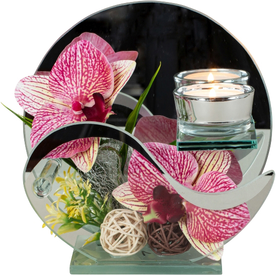 Glasdeko Teelichthalter im runden Design mit dunkelrosa Orchidee-Blüten ca. h=16cm b=16cm