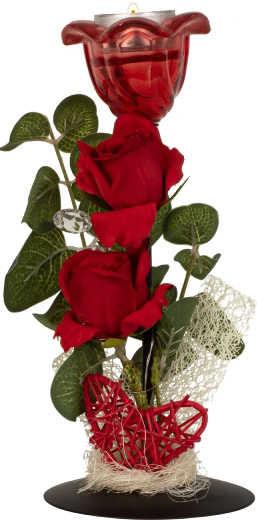 Metalldeko Gesteck für ein Teelicht, Teelichthalter in Rosenform geschmückt mit roten Rosen und Deko Applikationen ca. h=22cm b=9,5cm