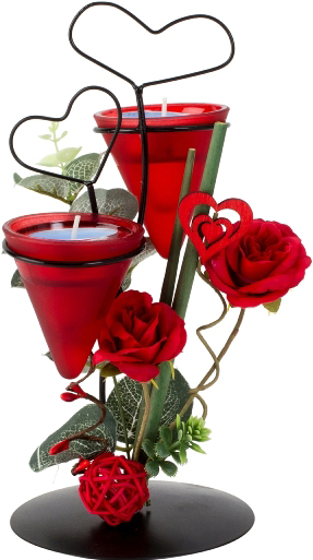 Metalldeko Gesteck für zwei Teelichter geschmückt mit roten Rosen, zwei Herzen u