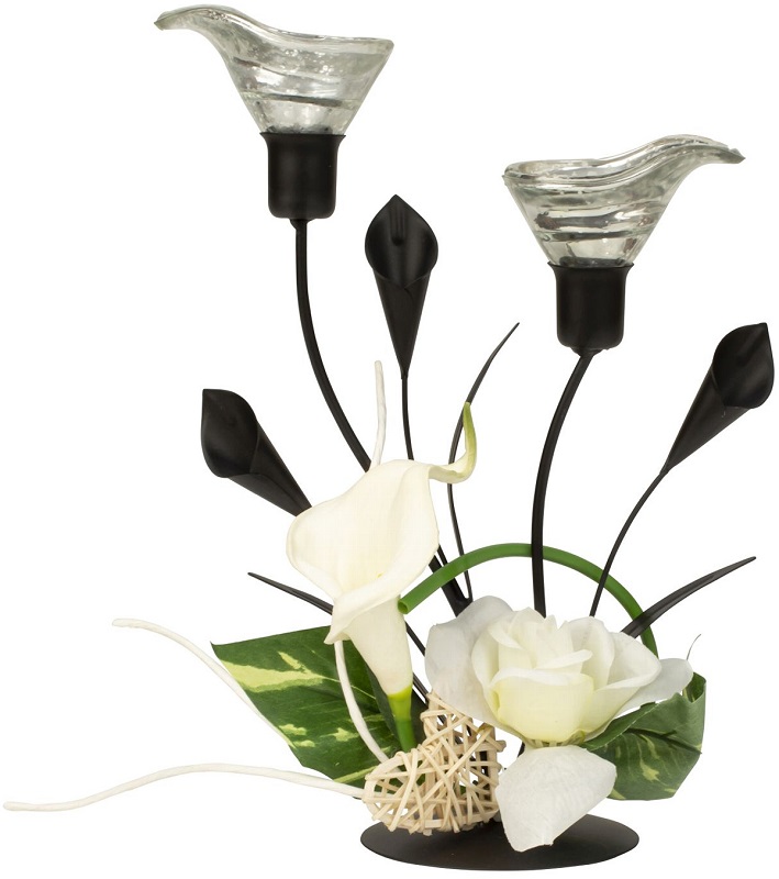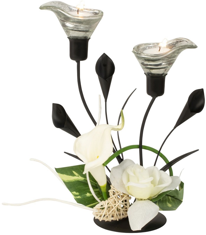 Metalldeko mit weißen Blumen verziert & 2 Teelichthaltern ca. 29,5 x 20cm