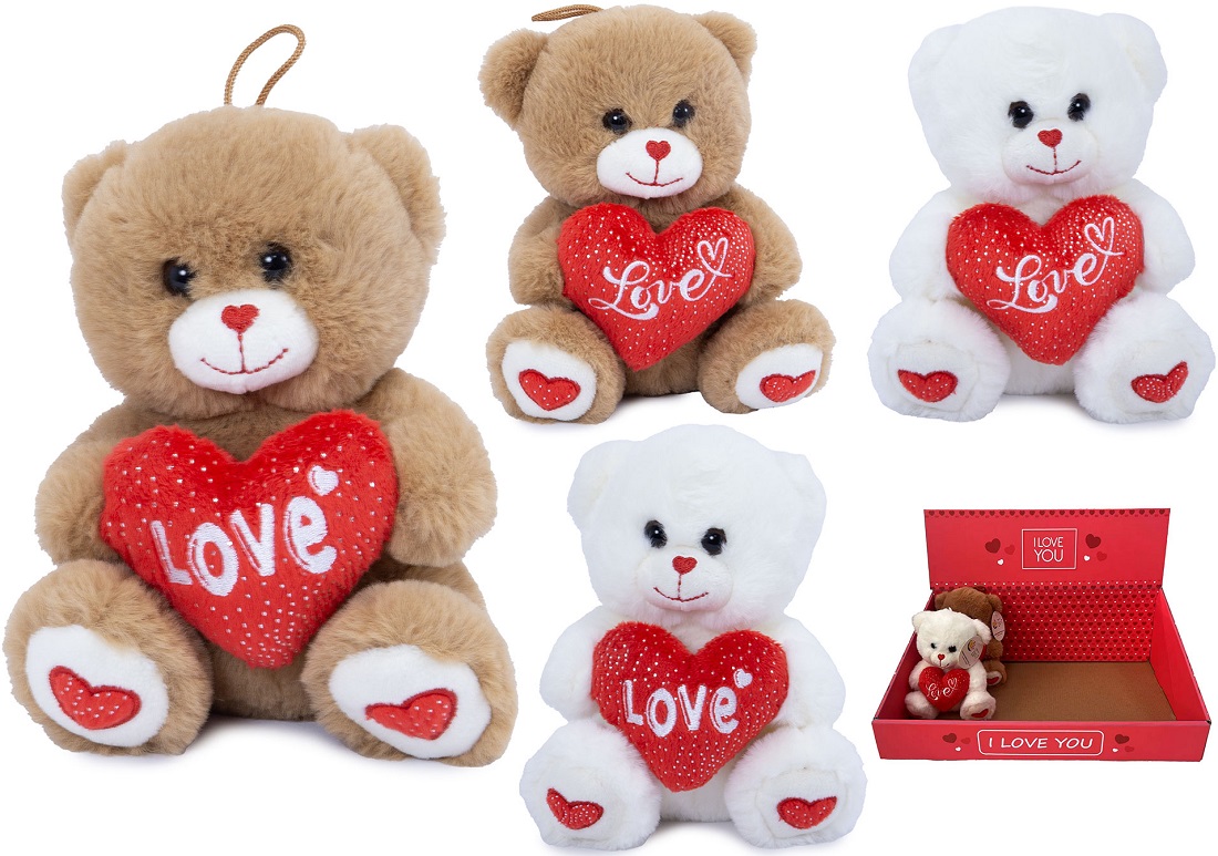 Plüsch Bär sitzend im Display mit Herz LOVE & Herzstickerei an Nase und Pfoten 2/s ca. 15cm im 12er T-Dsp. (Braun, Weiß)