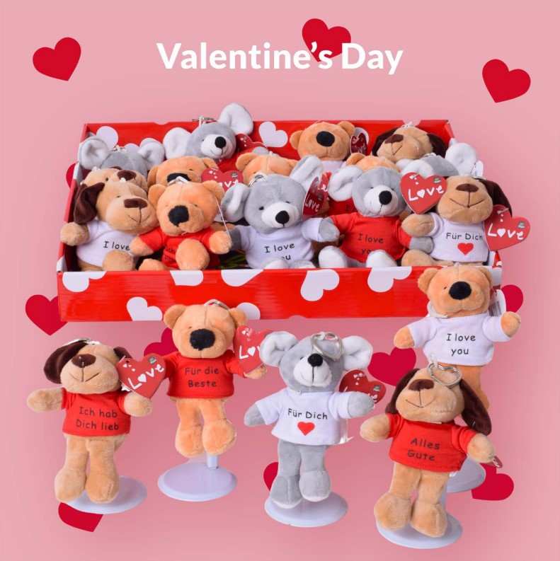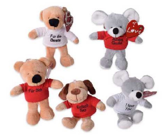 Plüsch Valentins Schlüsselanhänger Tiersortiment mit Sprüchen auf T-Shirts ca. 12cm 5/s im 24er T-Dsp.