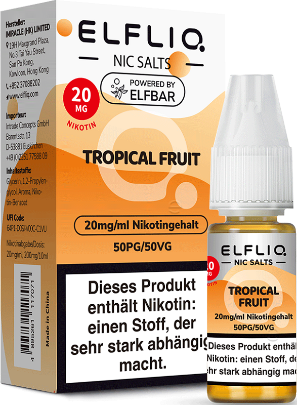 Elfbar ELFLIQ E-Liquid 20mg Nikotinsalz TROPICAL FRUIT (Tropische Frucht) á 10ml im 10er Dsp.(PG-VG Anteil 50/50 %)(mit Steuerbanderole)