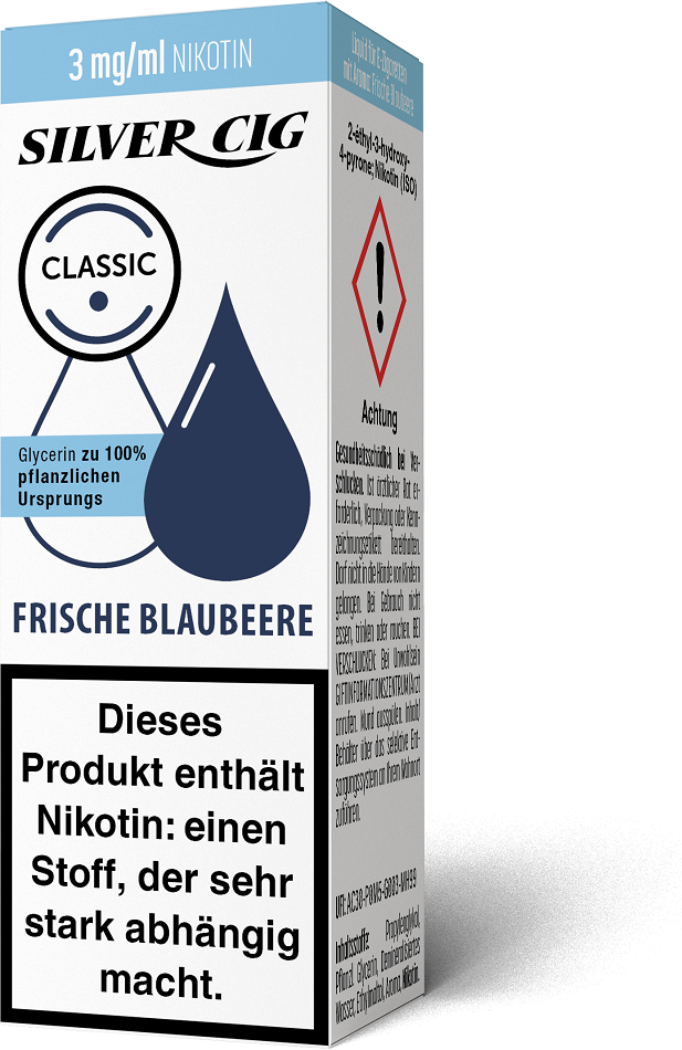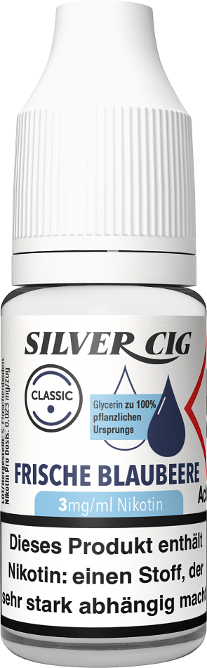 E-Liquid Silver-Cig FRISCHE BLAUBEERE 3mg/ml Nikotin 10ml im 5er Dsp.(DPT2 Konform EU Herstellung PG-VG Anteil 70/30%)(mit Steuerbanderole)
