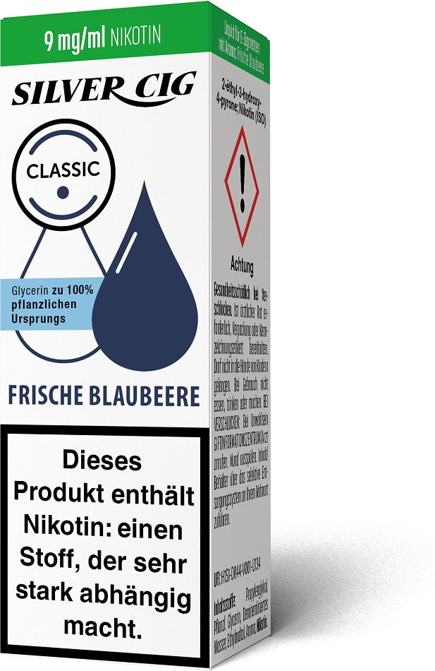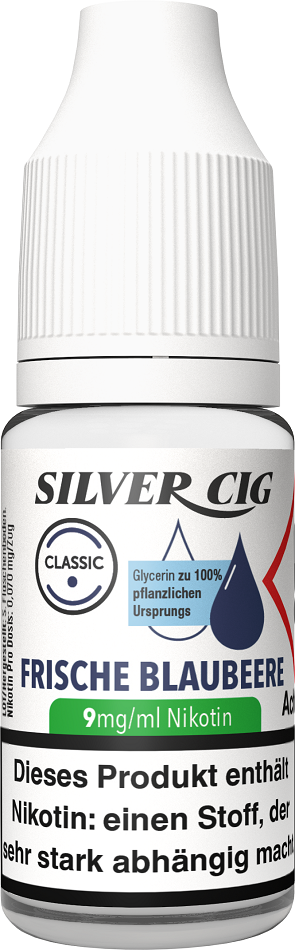 E-Liquid Silver-Cig FRISCHE BLAUBEERE 9mg/ml Nikotin 10ml im 5er Dsp.(DPT2 Konform EU Herstellung PG-VG Anteil 70/30%)(mit Steuerbanderole)