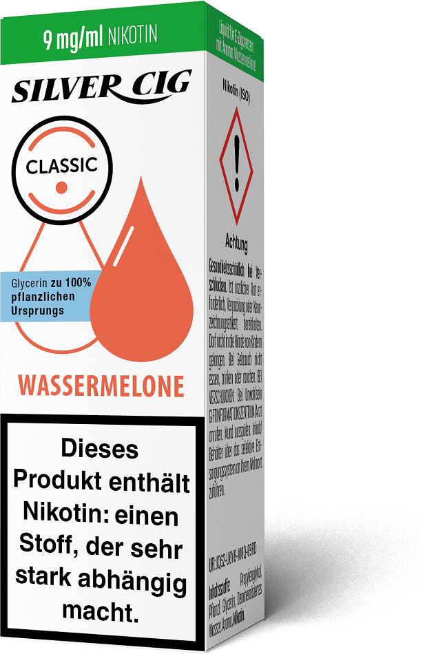 E-Liquid Silver-Cig WASSERMELONE 9mg/ml Nikotin 10ml im 5er Dsp.(DPT2 Konform EU Herstellung PG-VG Anteil 70/30%)(mit Steuerbanderole)