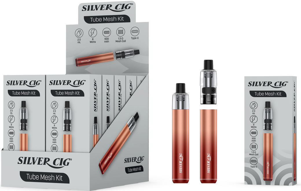 E-Zigarette Tube Mesh Kit RED Silver Cig 500mAh 8W 2ml Liquid Fassungsvermögen 1,3O Mesh Coil, aufladbar über USB-C