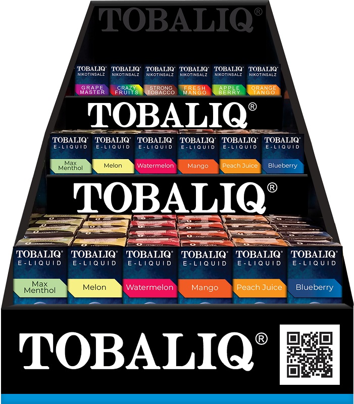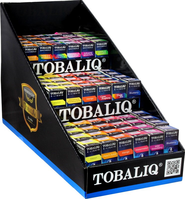 TobaliQ E-Liquid 72er Mix Display mit 18 Aromen in 3 versch. Nikotin Stärken - 24x 0mg Nikotin (je 4x: Melon, Peach Juice, Mango, Watermelon, Strawberry, Blueberry); 24x 6mg Nikotin (je 4x: Melon, Banana & Blackcurrant, Mango, Crazy Raspberry, Fruity Rio, Blueberry); 24x 18mg Nikotin (je 4x: Orange Tango, Fresh Mango, Crazy Fruits, Watermelon Lolipop, Grape Master, Apple Berry)