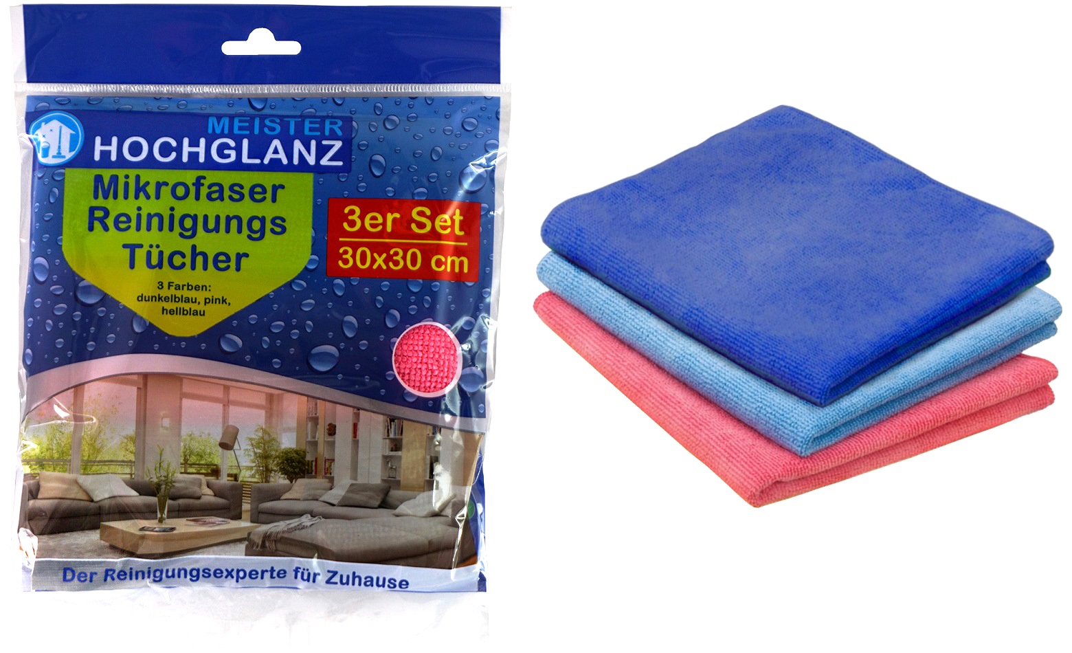 Mikrofasertücher 3er Set farbig sort. in Polybag mit Sichtfenster ca. 30x30cm