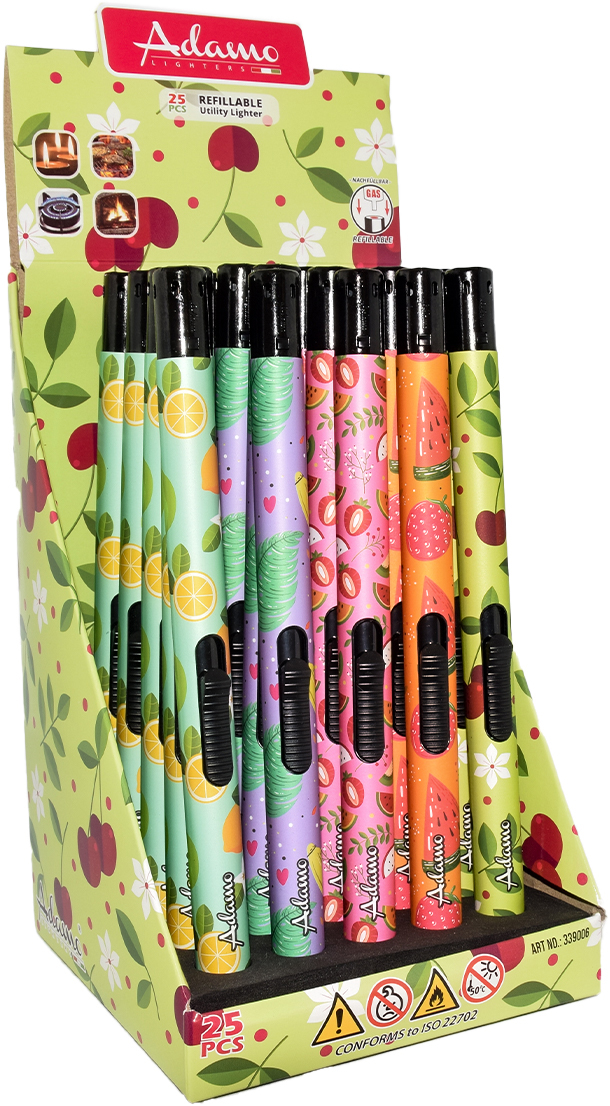 Stabfzg./Kerzenanzünder BBQ Slim Fruits Motive nachfüllbar 5/f ca. 21cm im 25er T-Dsp.