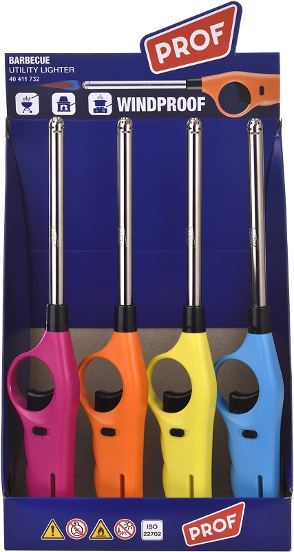 Stabfzg./Kerzenanzünder Sturmflamme Bunt sort., nachfüllbar, Windproof-Flamme, mit Füllmengenanzeige 4/s ca. 27cm (Pink, Orange, Gelb, Blau) im 16er T-Dsp.