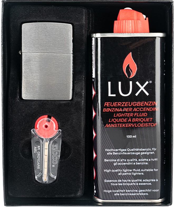 Zippo Geschenk Set mit Orginal Zippo Fzg. Chrom gebürstet + Benzin&Feuersteine