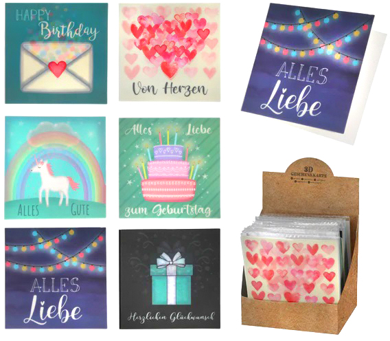 Geschenkkarten mit 3D Motiven 6/s ca. 13x13cm in 24er T-Dsp. (Happy Birthday, Von Herzen, Alles Gute, Alles Liebe zum Geburtstag, Alles Liebe, herzlichen Glückwunsch)
