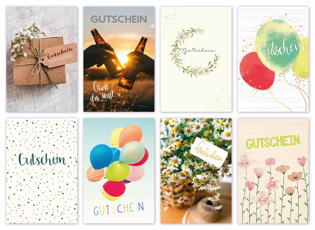 Gutscheinkarten ca. 11 x 16cm 8/s mit schlichten Motiven, im Polybeutel