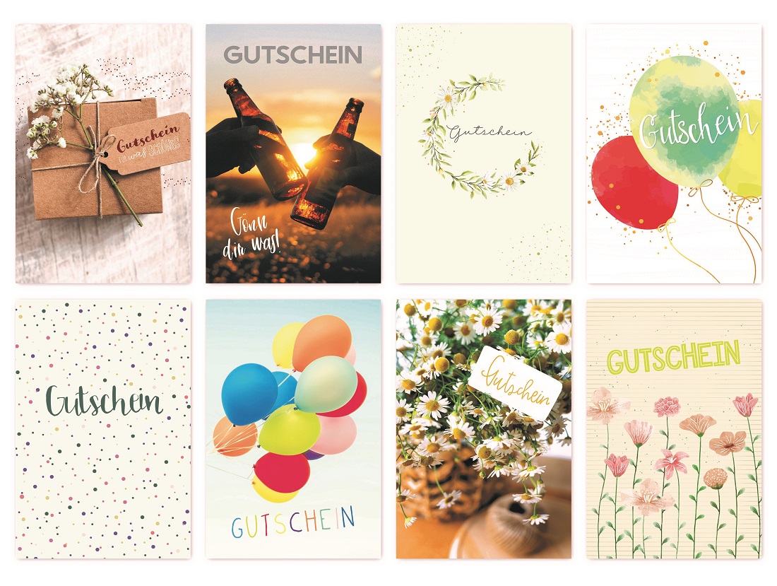 Gutscheinkarten für verschiedene Anlässe 8/s 100er Pack mit Umschlag Einzelfolie