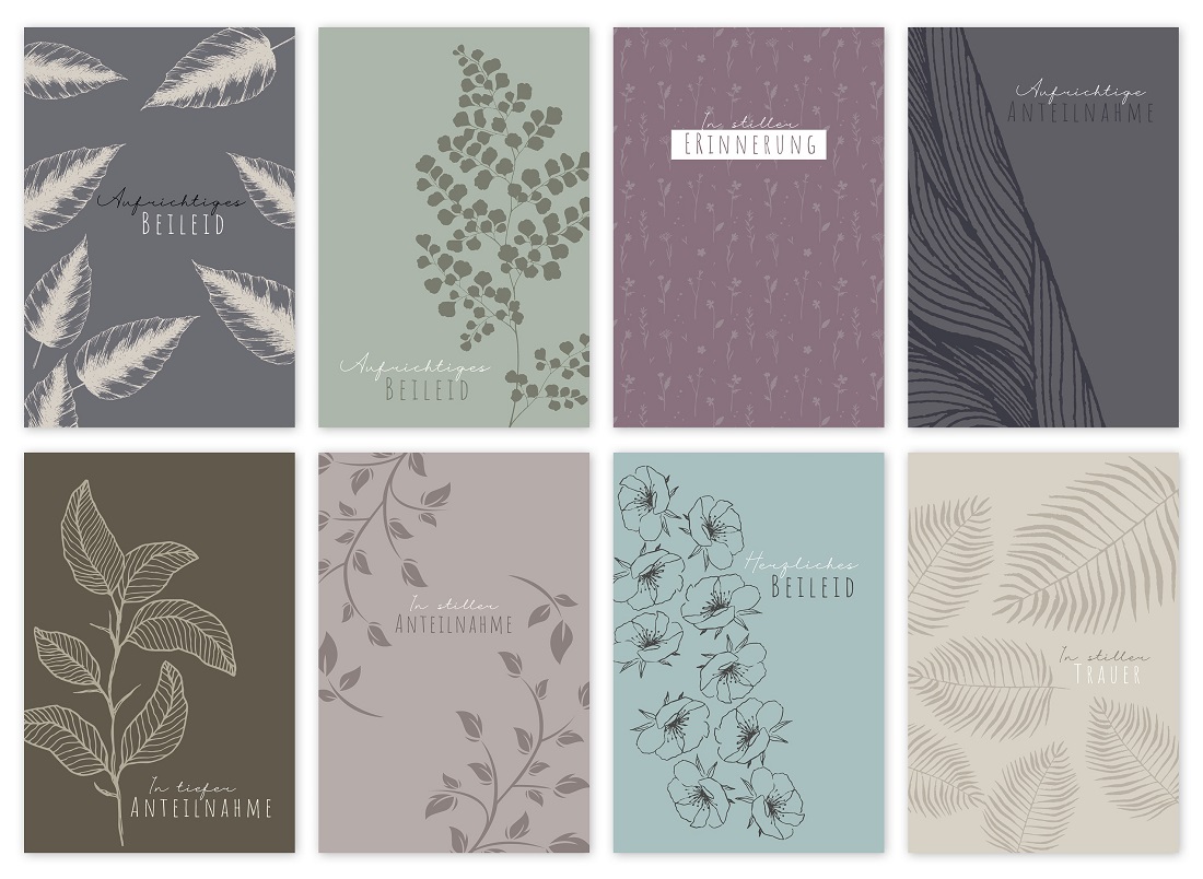 Trauerkarten ca. 10 x 17cm 8/s mit schlichten Motiven zum Ausdrücken Ihrer Anteilnahme in schweren Zeiten, im Polybeutel