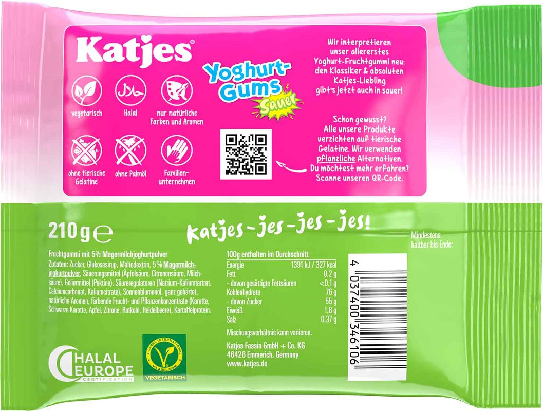 Katjes Yoghurt Gums Sauer softes & suares Joghurt-Fruchtgummi mir natürlichen Aromen & Farben, Gelantinefrei, Für Vegetarier geeignet im 210g Beutel