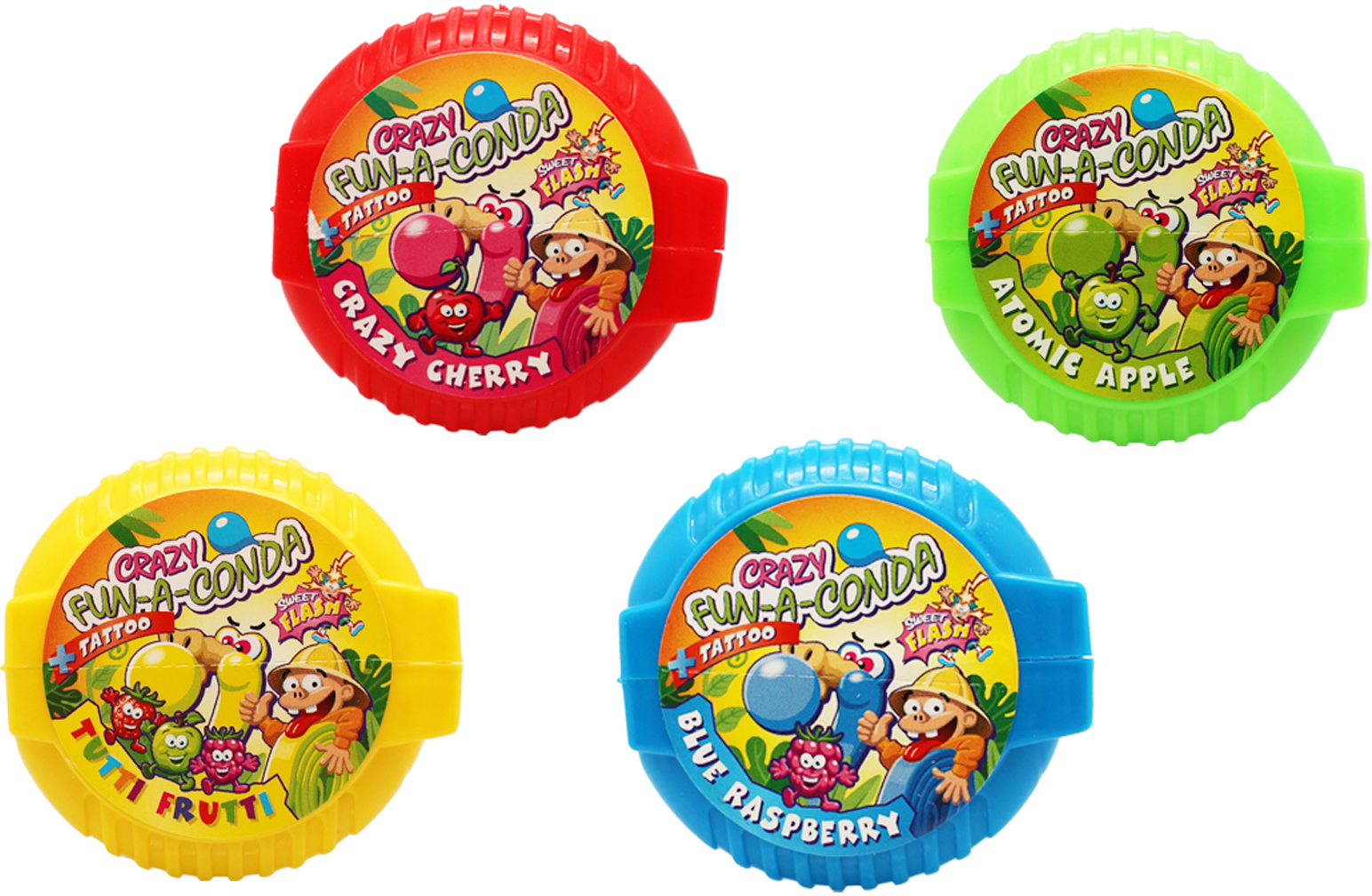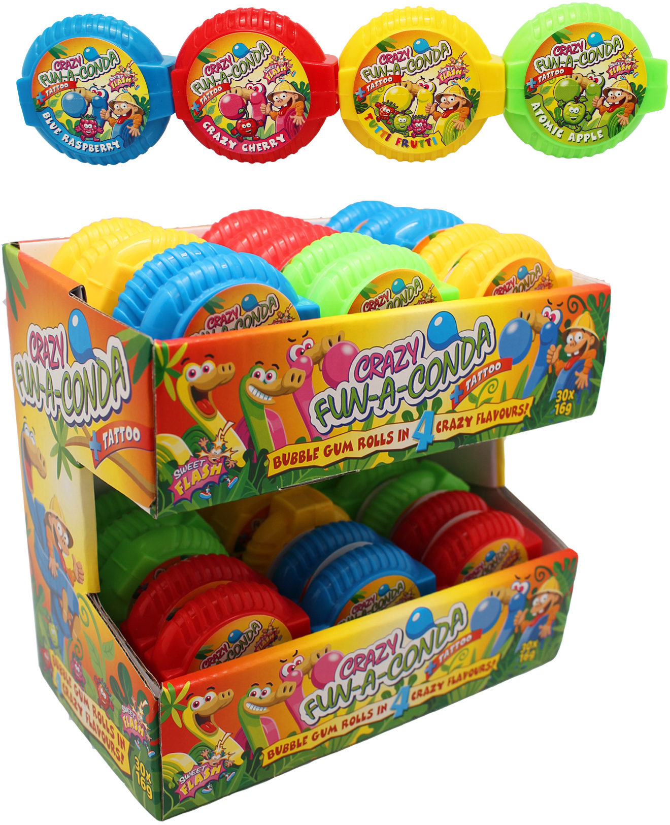 Crazy Fun-a-Conda mit Tattoo Bubble Gum Rolls 4/s (Blaubeere, Crazy Cherry, Tutti Frutti, Aromic Apple) in 30er T-Dsp.