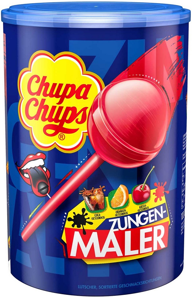Chupa-Chups Zungenmaler zungenfäbende Kugel-Lollis in 3 versch. Geschmäckern (Cola, Kirsche & Orange) á 12g in 100er Rundsichtbox