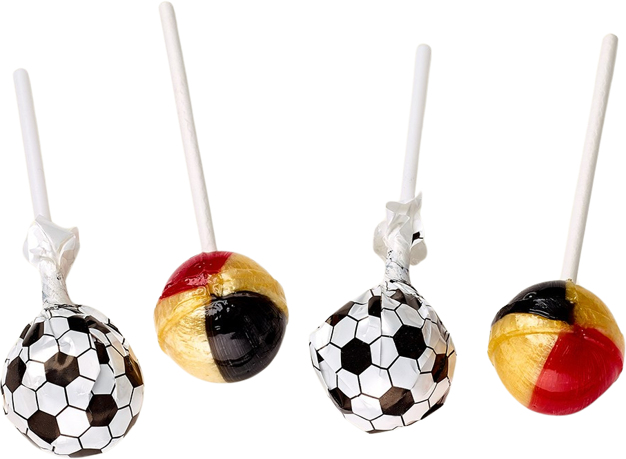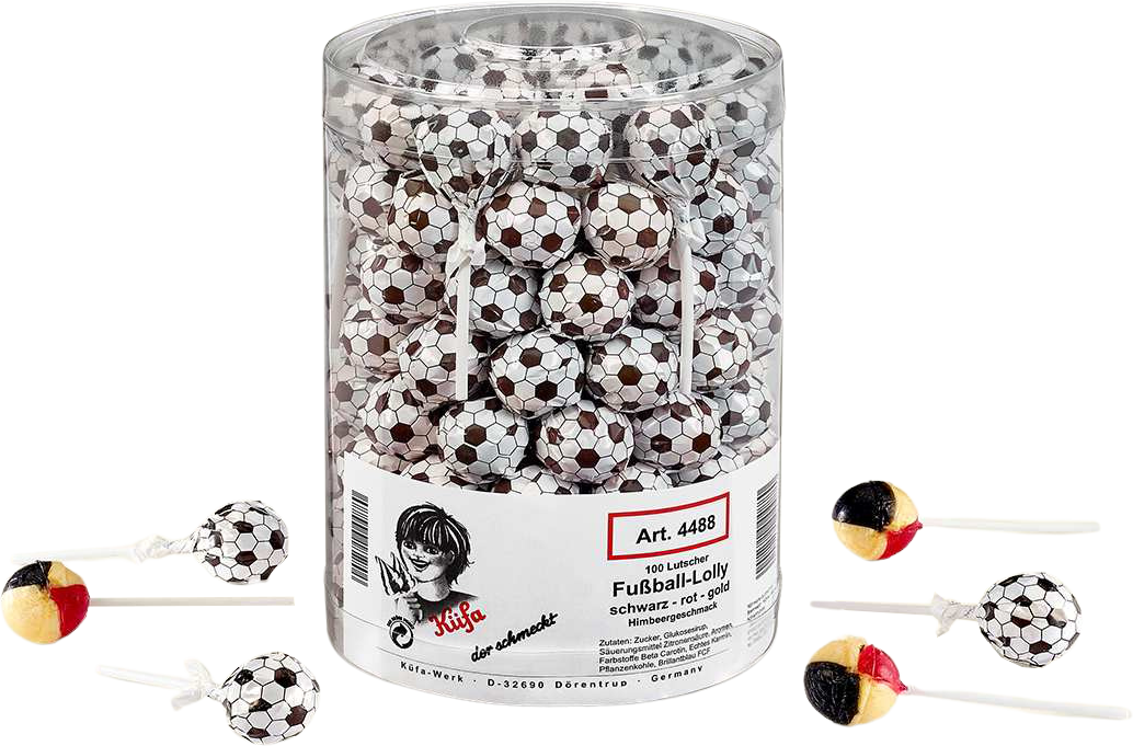 Küfa Fußball-Lolly Wickler im Fußball-Design und Lollis in schwarz, rot, gold mit Himbeer-Geschmack in 100er Dose