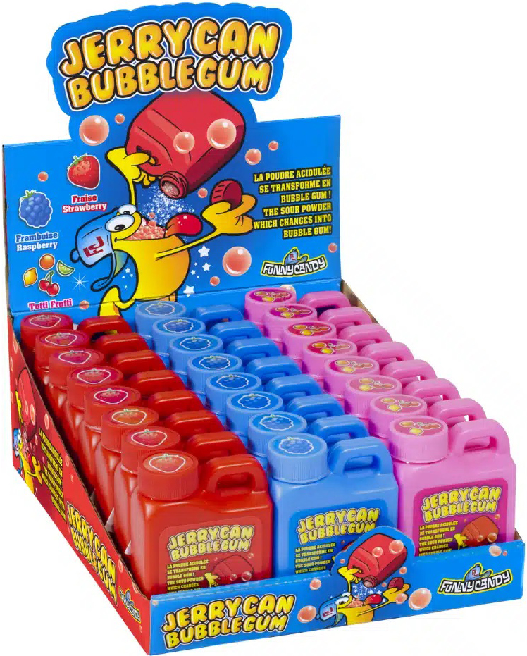 Funny Candy Jerrycan Sour Bubblegum Powder, saures Kaugummi Puder in kleinen Kanistern á 35g 3/s (Erdbeere, Blaubeere, Tutti Frutti) im 24er T-Dsp.