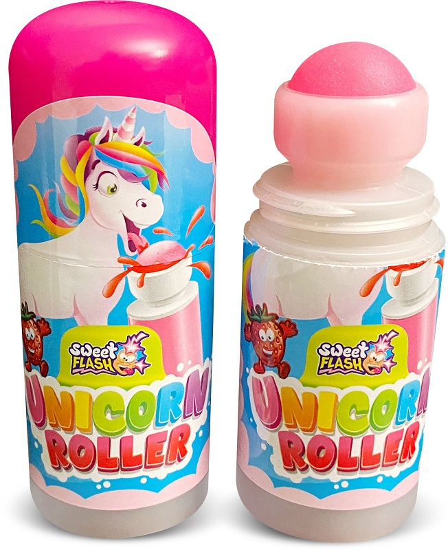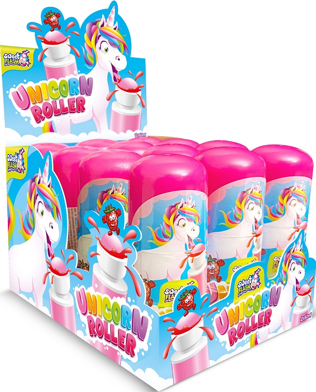 Sweet Flash Unicorn Roller Erdbeer Candy Roller mit Einhorn Motiv Pink im 12er T-Dsp.