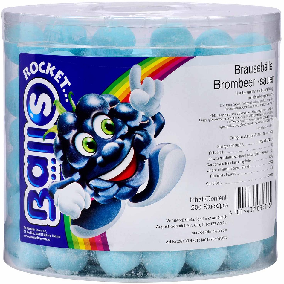 Rocket Balls Brombeere Hartkaramell Brausebälle mit Brausefüllung und Brombeer-Geschmack in 200er Runddose