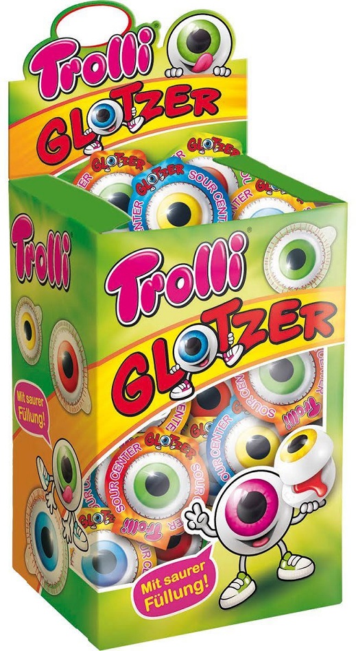 Trolli Pop Eyes 6/s Schaumzucker- und Fruchtgummi-Bonbons in Augapfelform mit flüssiger extrasaurer Füllung in 30er T-Dsp.