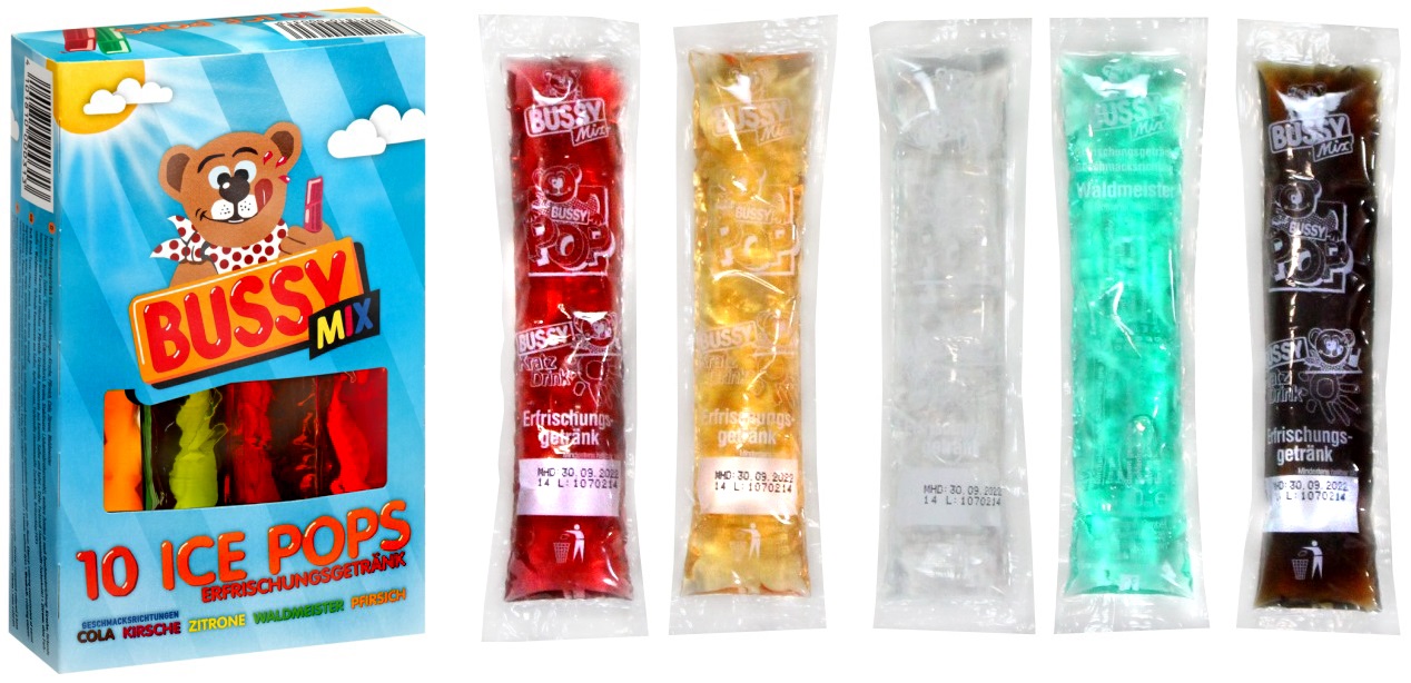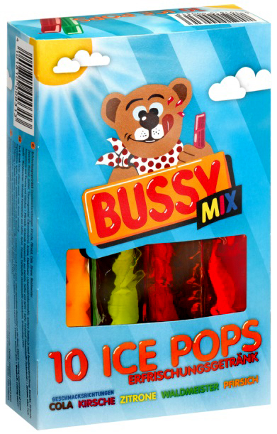 Bussy Mix Wassereis Schleckdrink 10x 40ml in Farbbox (Waldmeister, Zitrone, Pfirsich, Cola, Kirsche)