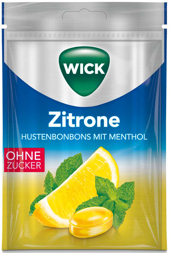 Wick Zitrone Zitronensaft-Konzentrat und Menthol Hustenbonbons zuckerfrei 72g Be