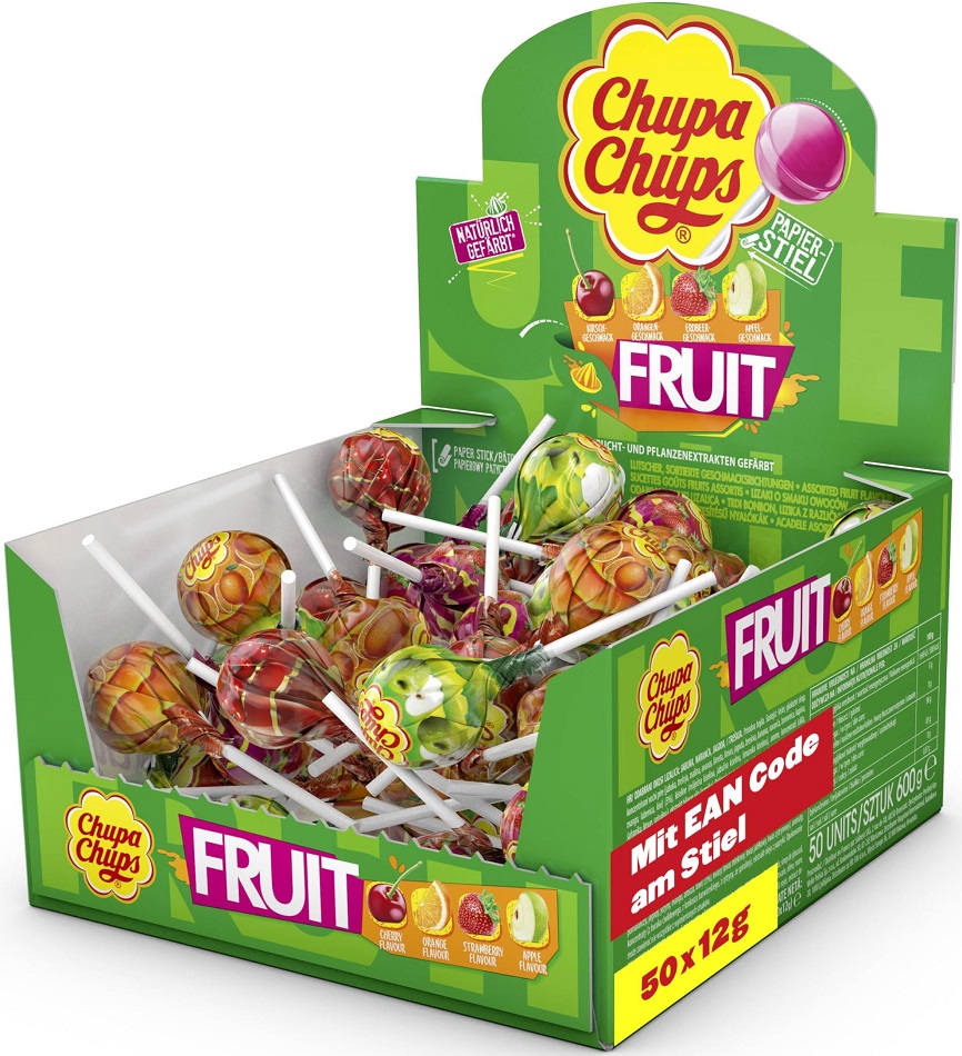 Chupa-Chups Fruit Kugel-Lollis mit 4 fruchtige Geschmäckern (Apfel, Erdbeere, Orange & Kirsche) á 12g im 50er T-Dsp.