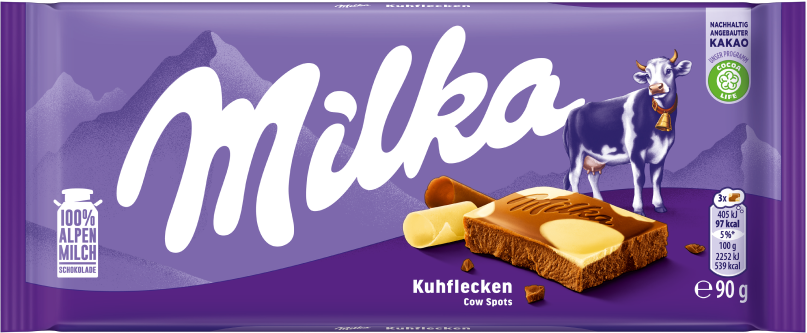 Milka Kuhflecken Schokoladen Tafel 90g aus nachhaltig angebautem Kakao & 100% Alpenmilch mit Kuhflecken aus weißer Schokolade