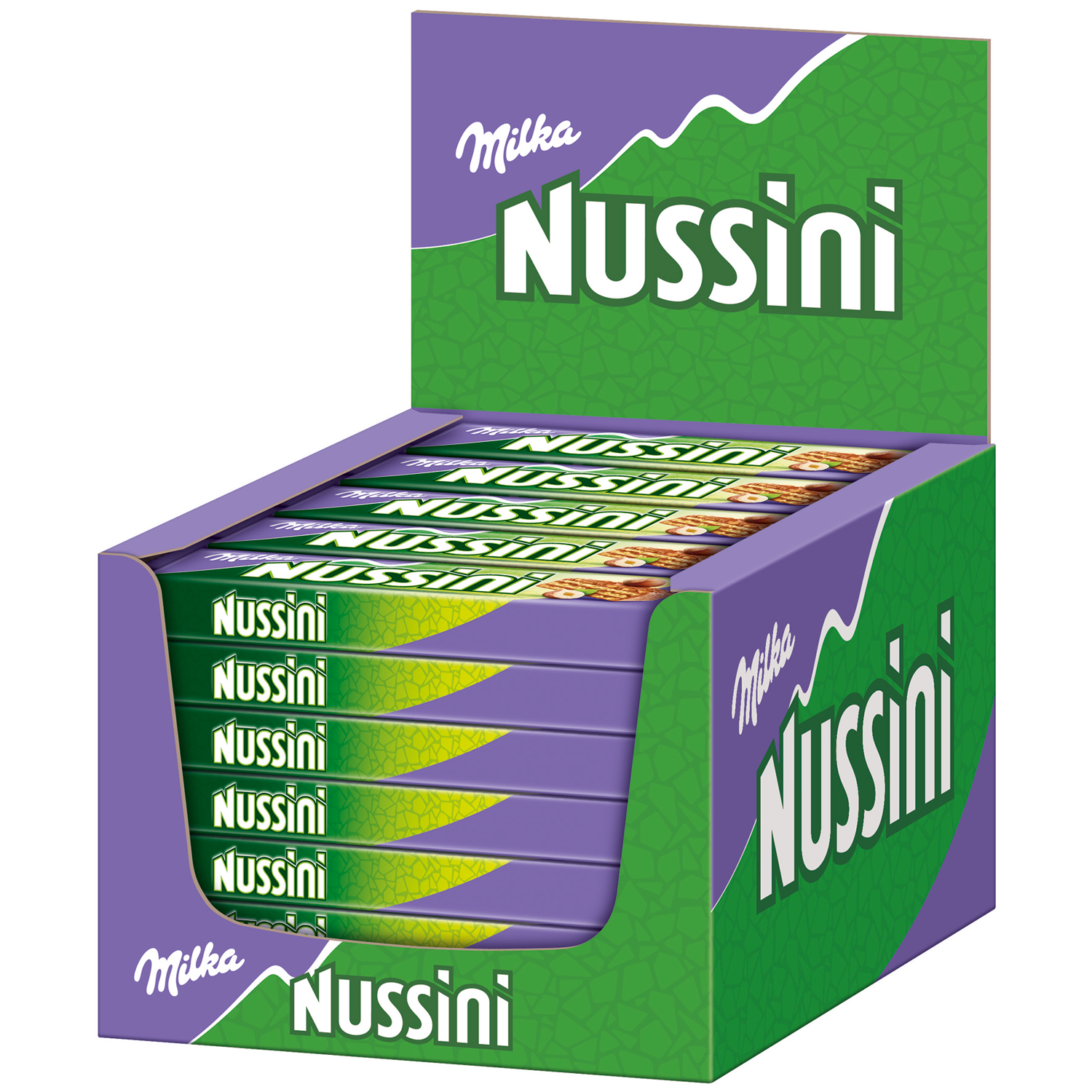 Milka Riegel Nussini 31,5g Knusperwaffel-Riegeln mit Haselnuss-Creme-Füllung, gehackten Haselnüssen und Überzug aus Alpenmilch-Schokolade 35er T-Dsp.