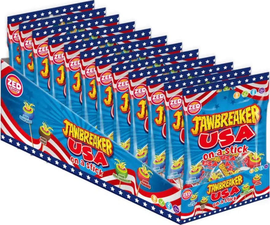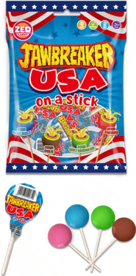 Zed Jawbreaker On-A-Stick USA Saure Lolli Pops mit Kaugummi Kern (Blue Razz, Cola, Watermelon, Cherry) im 160g Beutel (Halal)