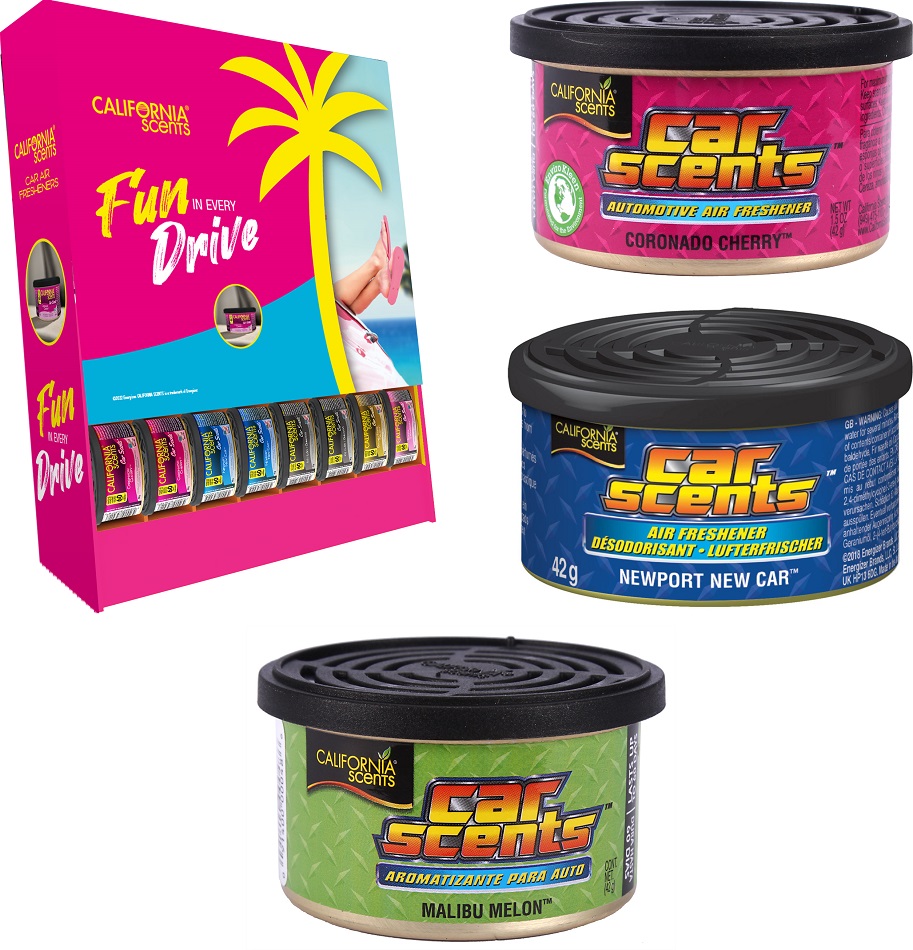 California Scents 36er MIX mit Gratis Thekendisplay ca. 39x45x13cm inkl. 12x Coronado Cherry (91474), 12x New Car (91902); 12x Malibu Melon (91898)