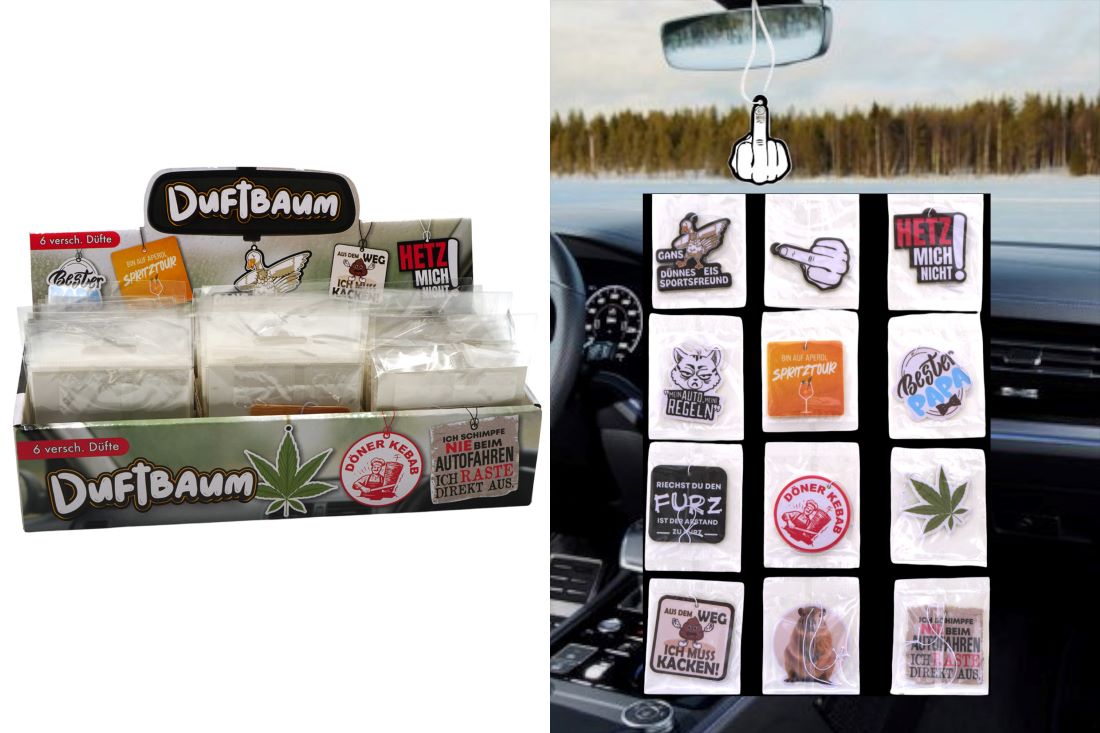 Duftbaum mit lustigen Sprüchen & Motiven ca. Ø6cm 12 Designs & 6 Düfte im 72er T
