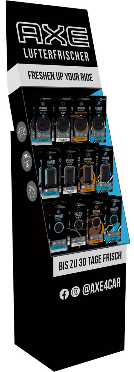 AXE Air Fresher Bodendisplay Mix-Display 88tlg. (48x3D Hang.+16xVentAir+24xMini Vent) 88er B-Dsp. 1/8 Palette