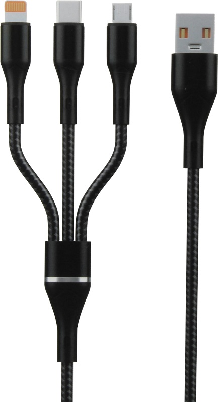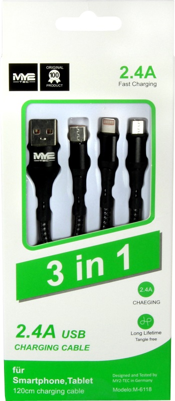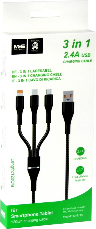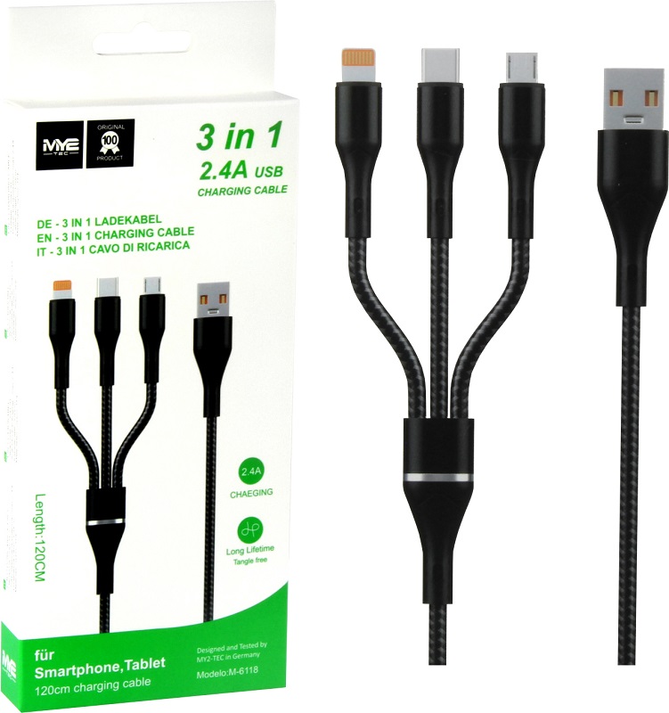 3-in-1 Lade-/Datenkabel geflochtenes Kabel 5V 2,4A USB zu Micro USB/lightning/USB-C ca. 120cm