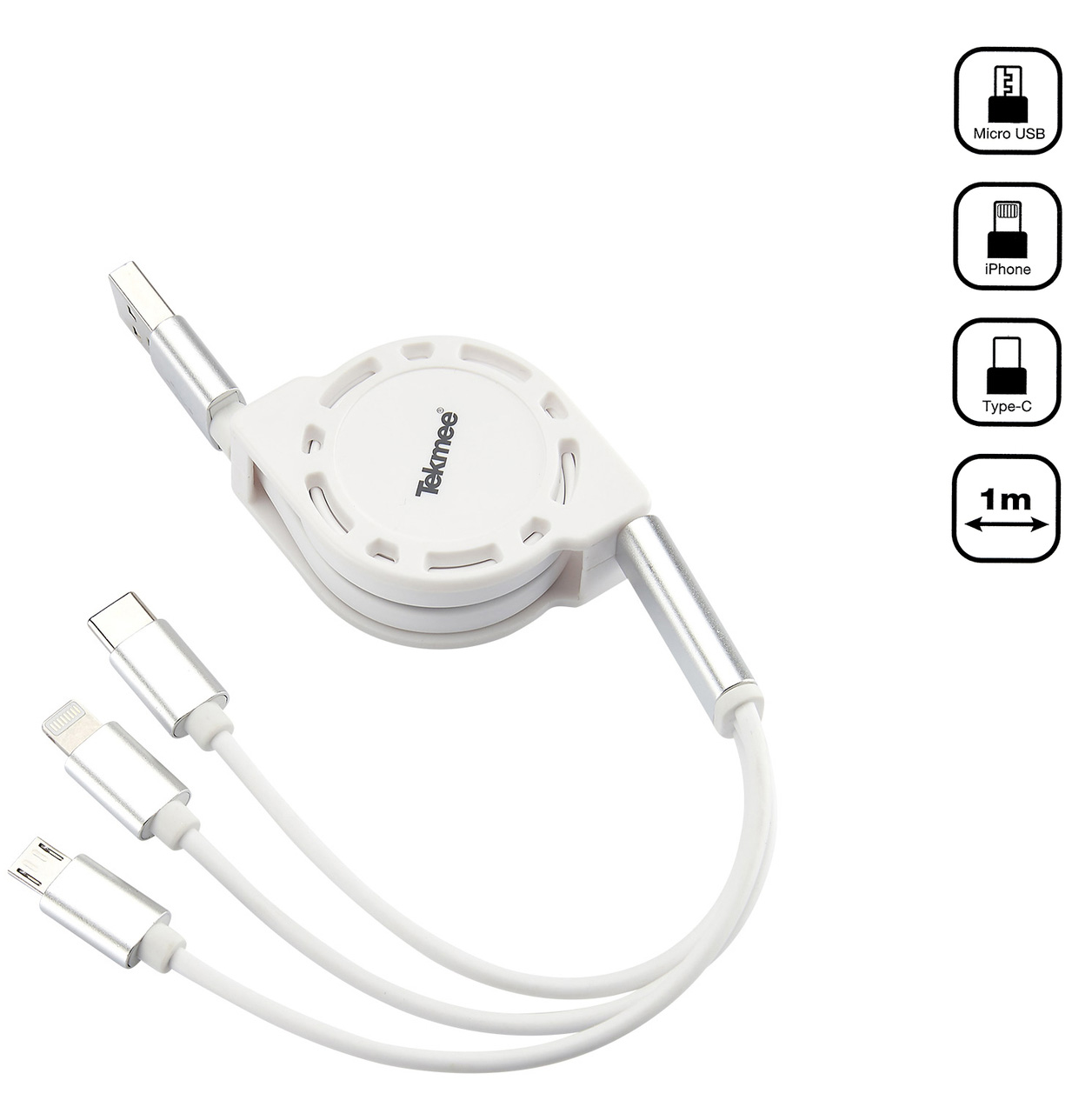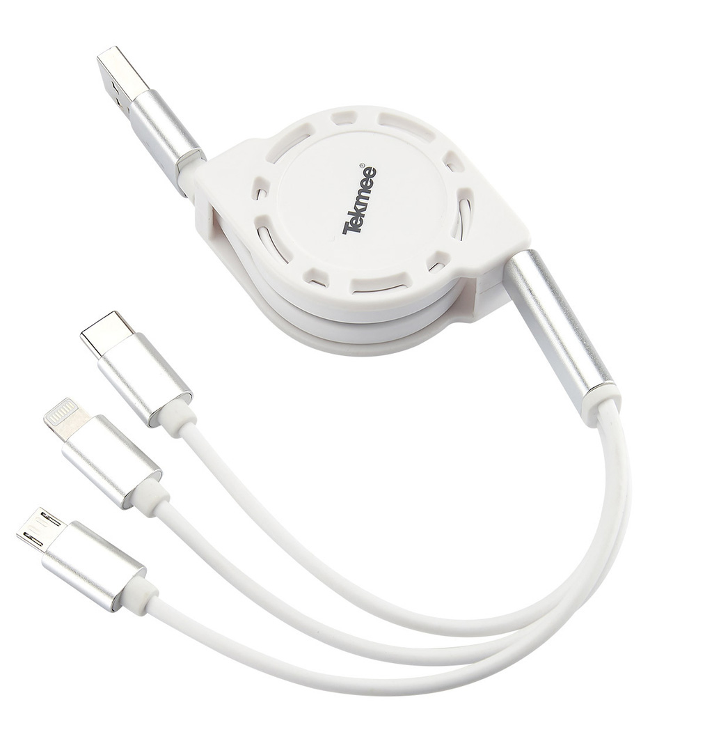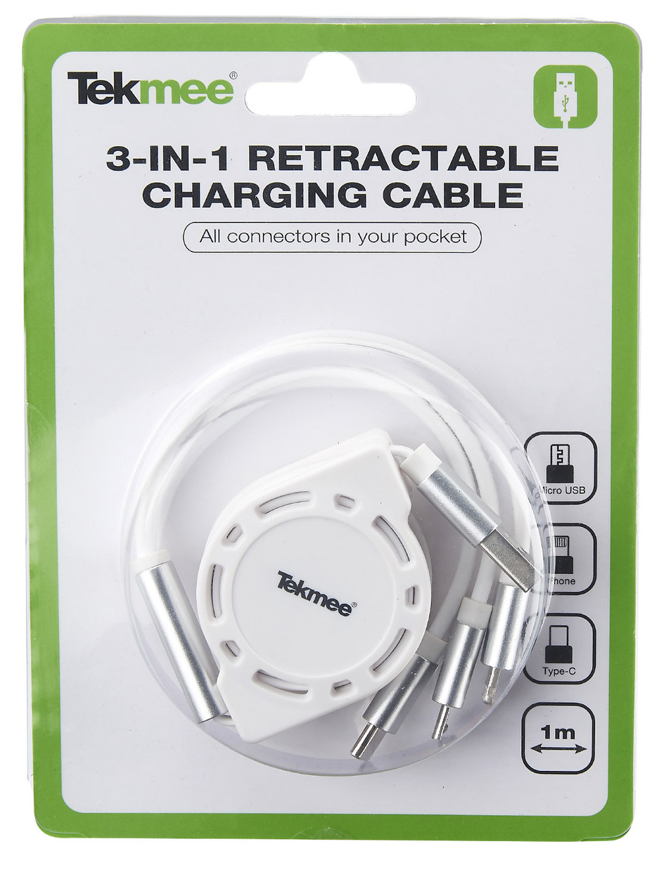 Handy Ladekabel 3 in 1 Aufziehbar USB auf Iphone,Samsung Micro, Typ-C ca. 1 m in Blister