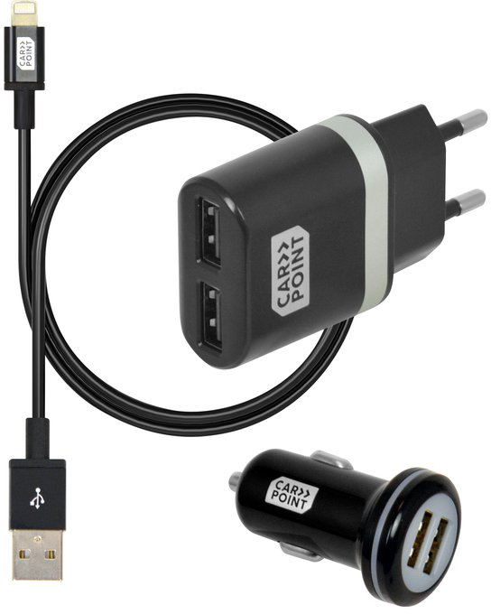 Premium Charging Kit 3tlg. für Auto & Haus 12V/220V (Lightning Ladekabel ca. 1m, KFZ-Adapter mit 2 Anschlüssen, USB-Netzteil mit 2 Anschlüssen)