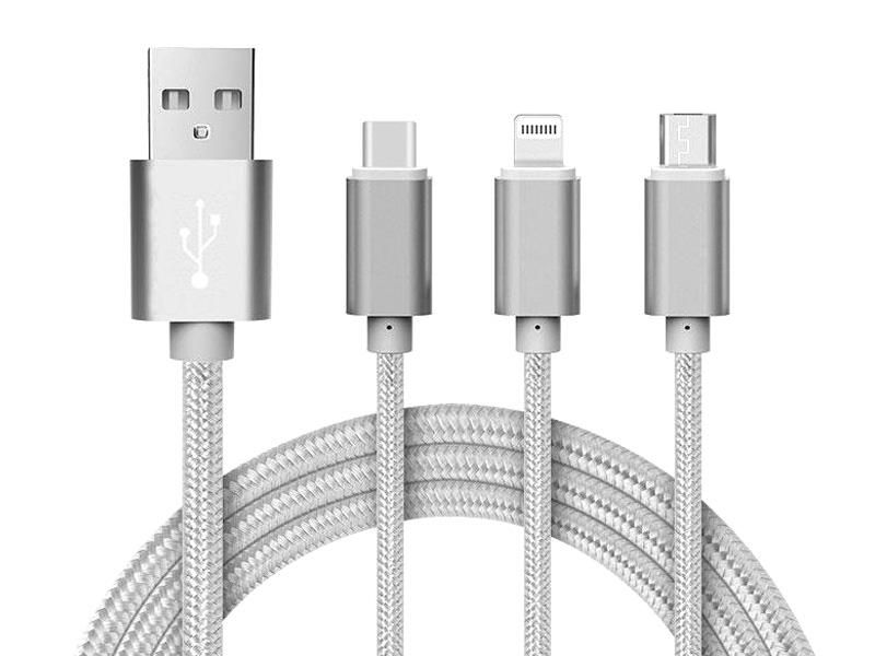 Reekin 3 in 1 Ladekabel (USB Micro, USB Type-C & Lightning) - 1,2 Meter (Silber-