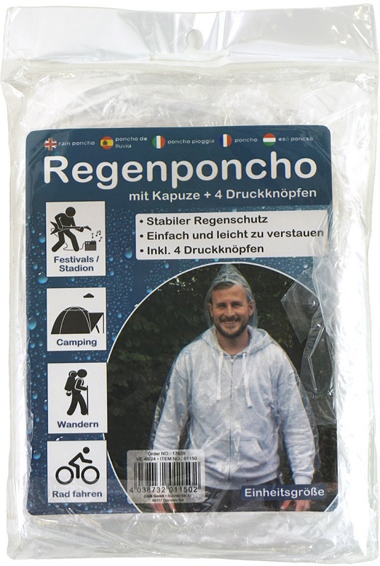 Regenponcho mit Kapuze Transparent mit 4 Druckknöpfen, im Polybag