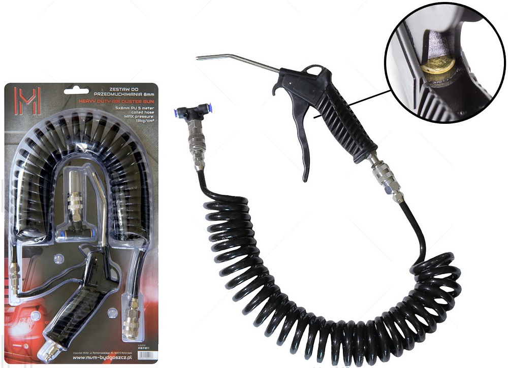 Drucklufttschlauch Schwarz mit Ausblaspistole für LKW´s 8mm Spiralschlauch max. 10 kg/cm2 ca. 5m, mit Schnellkupplung, T-Stück Blister