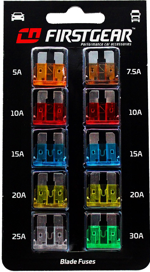 KFZ-Flachsicherungen FirstGear UNI Standard Ersatzsicherungen 10St. Blister(1 x 5A, 1 x 7.5A, 2 x 10A, 2 x 15A, 2 x 20A, 1 x 25A, 1 x 30A)