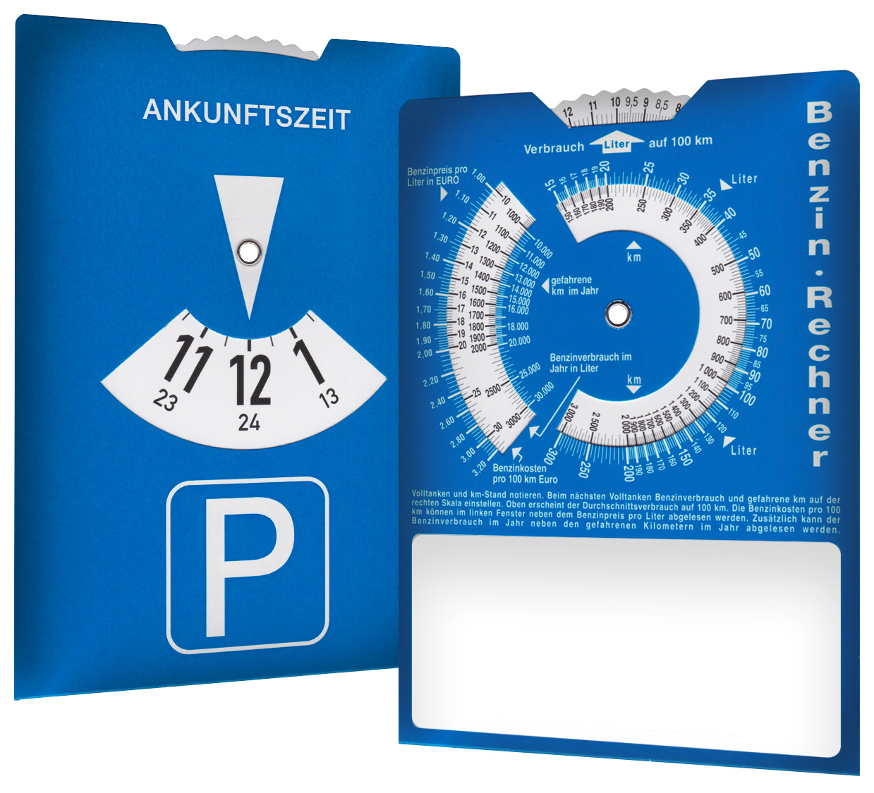 Parkscheibe mit Benzinrechner aus Chromokarton Hülle 230 g/m² 110x150mm