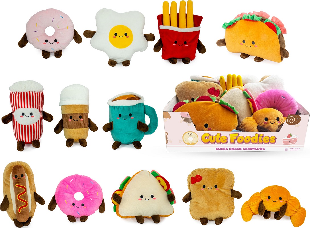 Plüsch Snack Sammlung 12/s ca. 16-22cm im 12er T-Dsp. (Donut, Spiegelei, Pommes, Taco, Milkshake, Kaffee, Kakao, Hot Dog, Donut, Sandwich, Toast, Croissant)